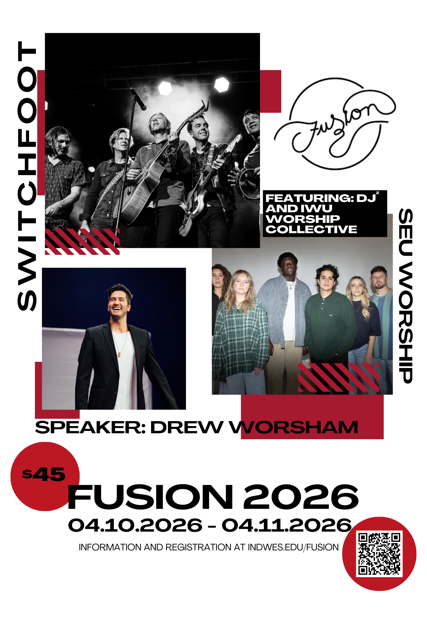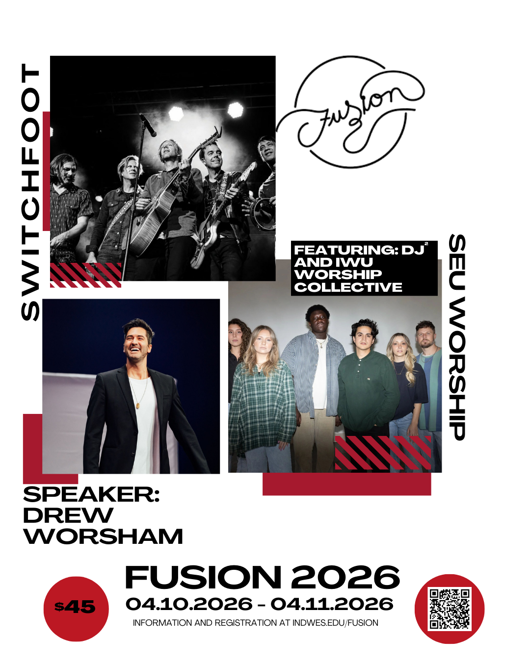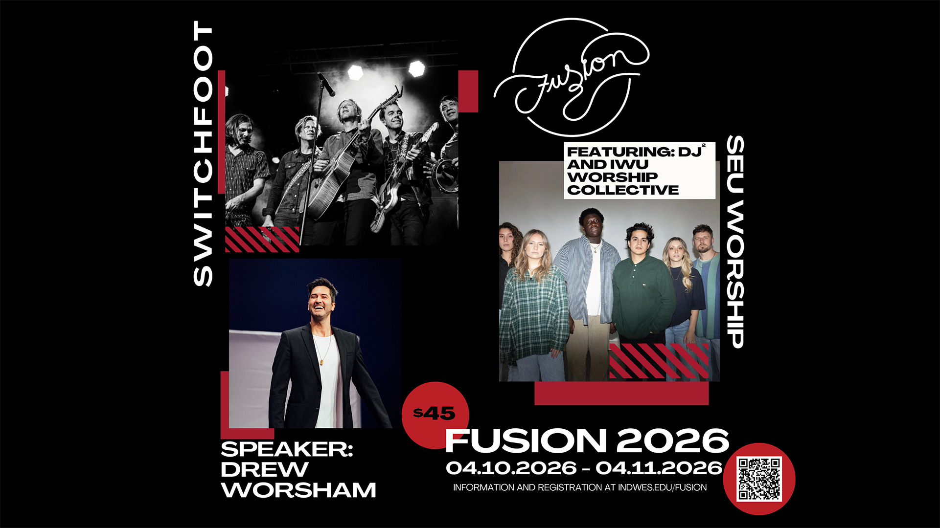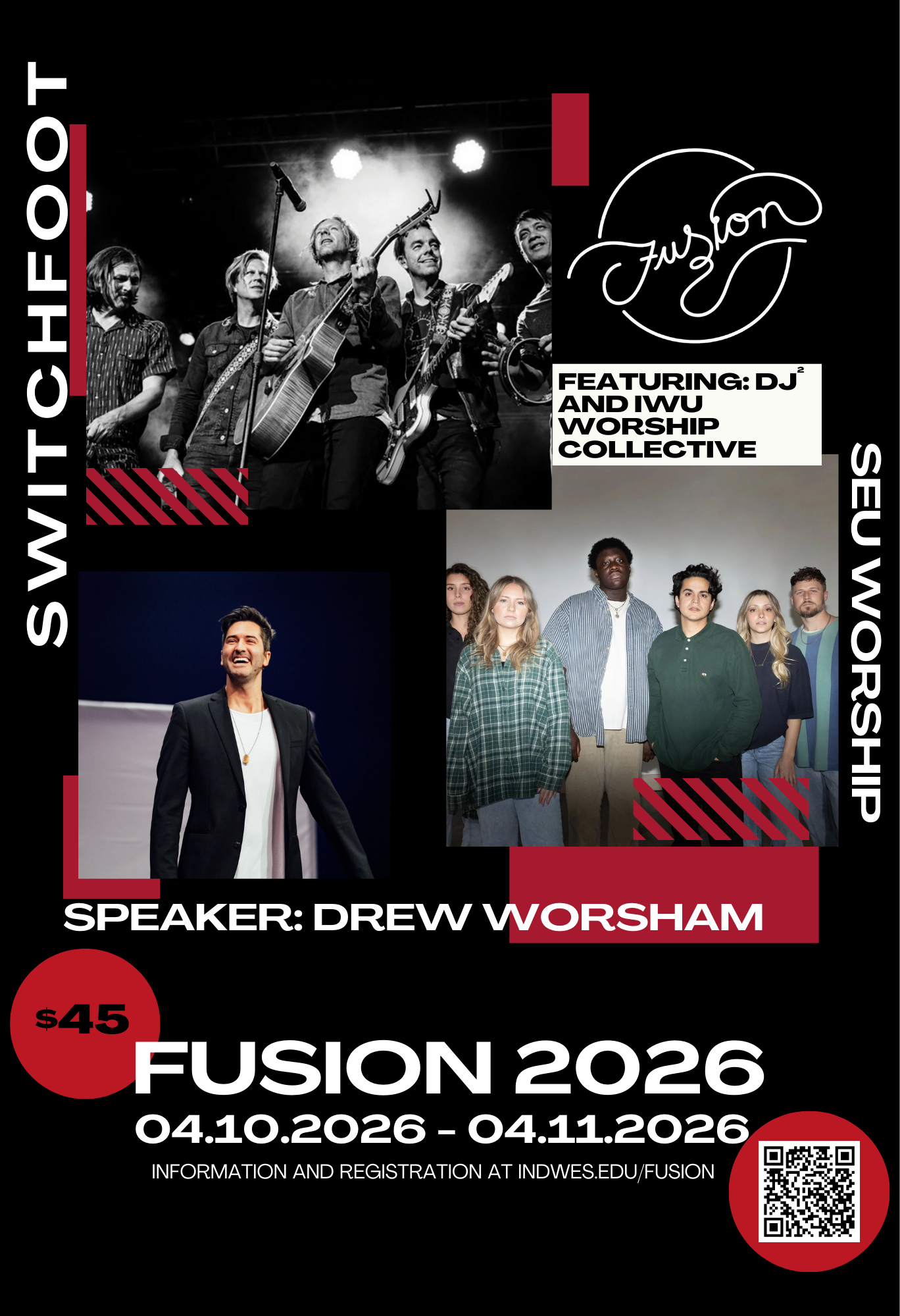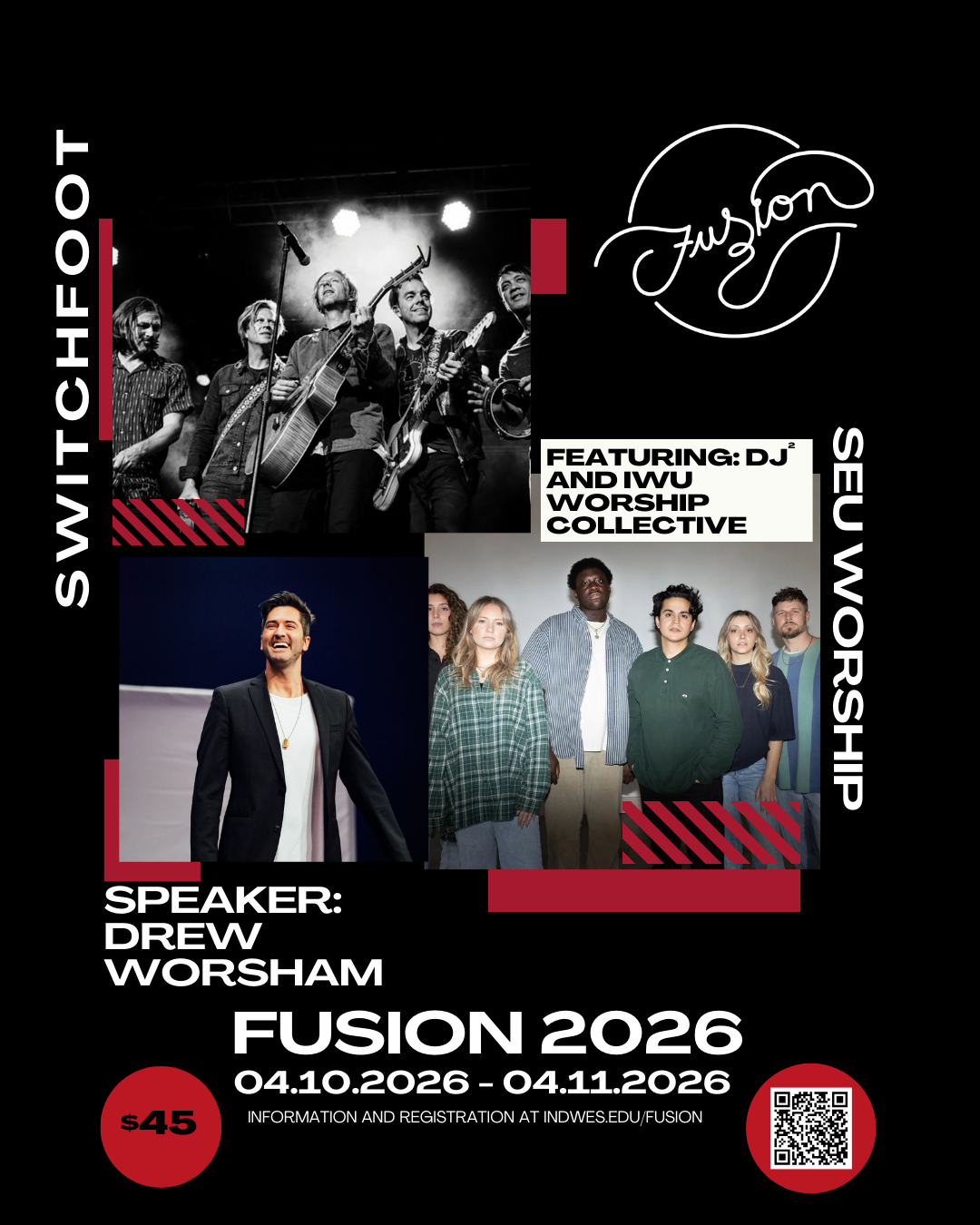 You'll encounter God in fresh, exciting ways with our incredible line-up... featuring Switchfoot, SEU Worship, Drew Worsham, DJ 2, and the IWU Worship Collective. The Friday night concert admission is included in your $45 (per person) Fusion registration fee.